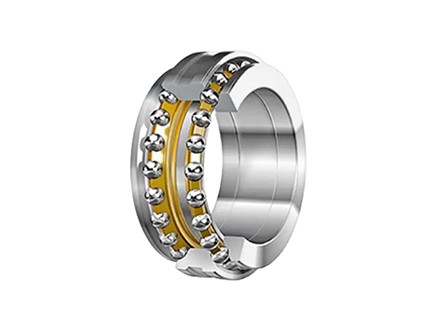 双向推力用接触球轴承由两个轴圈、一个座圈、一个隔套和两列滚动体及保持架组件组成。修磨隔套的厚度即可调整轴承的间隙和预紧。轴承的接触角为60°。该轴承的公称外径和与其配套的双列圆柱滚子轴承的外径相同,但外圈与箱体孔之间有间隙,因而,双向推力角接球轴承不承受径向载荷,与双列圆柱滚子轴承配套使用以承受双向轴向载荷。